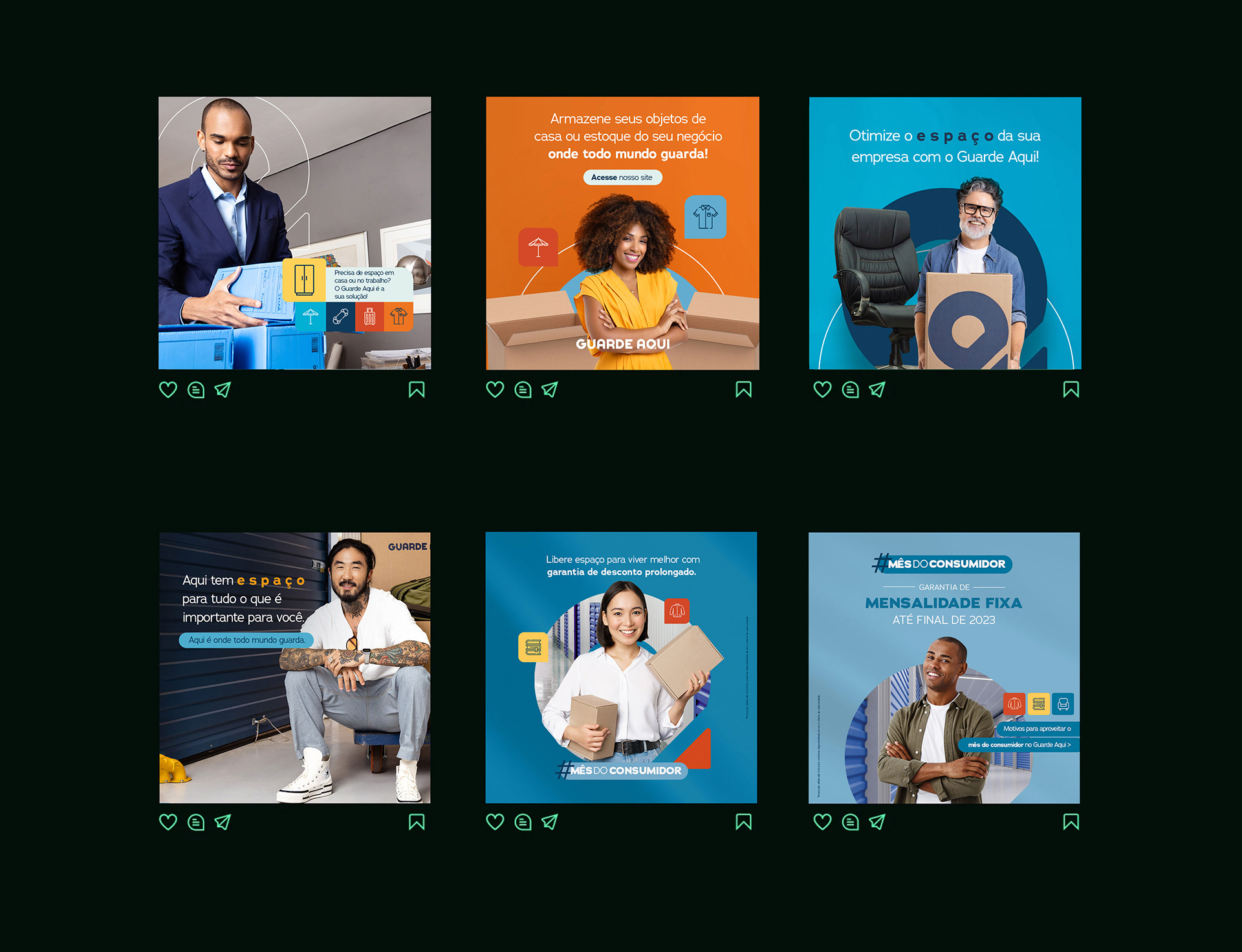 Criamos uma narrativa mais empática para a marca com uma estratégia que contextualiza o negócio e deixa um convite para participar dessa experiência. Com o posicionamento – ONDE TODO MUNDO GUARDA – destacamos a marca com uma linguagem visual mais amigável, num tom de comunicação mais divertido e leve, desmistificando a oferta dos serviços de locação de espaços dos self storages.